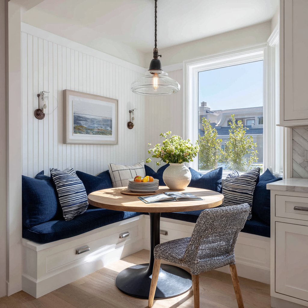 Designer tip: Position nooks near windows when possible to take advantage of natural light and outdoor views that enhance the connection between indoor and outdoor farmhouse living.