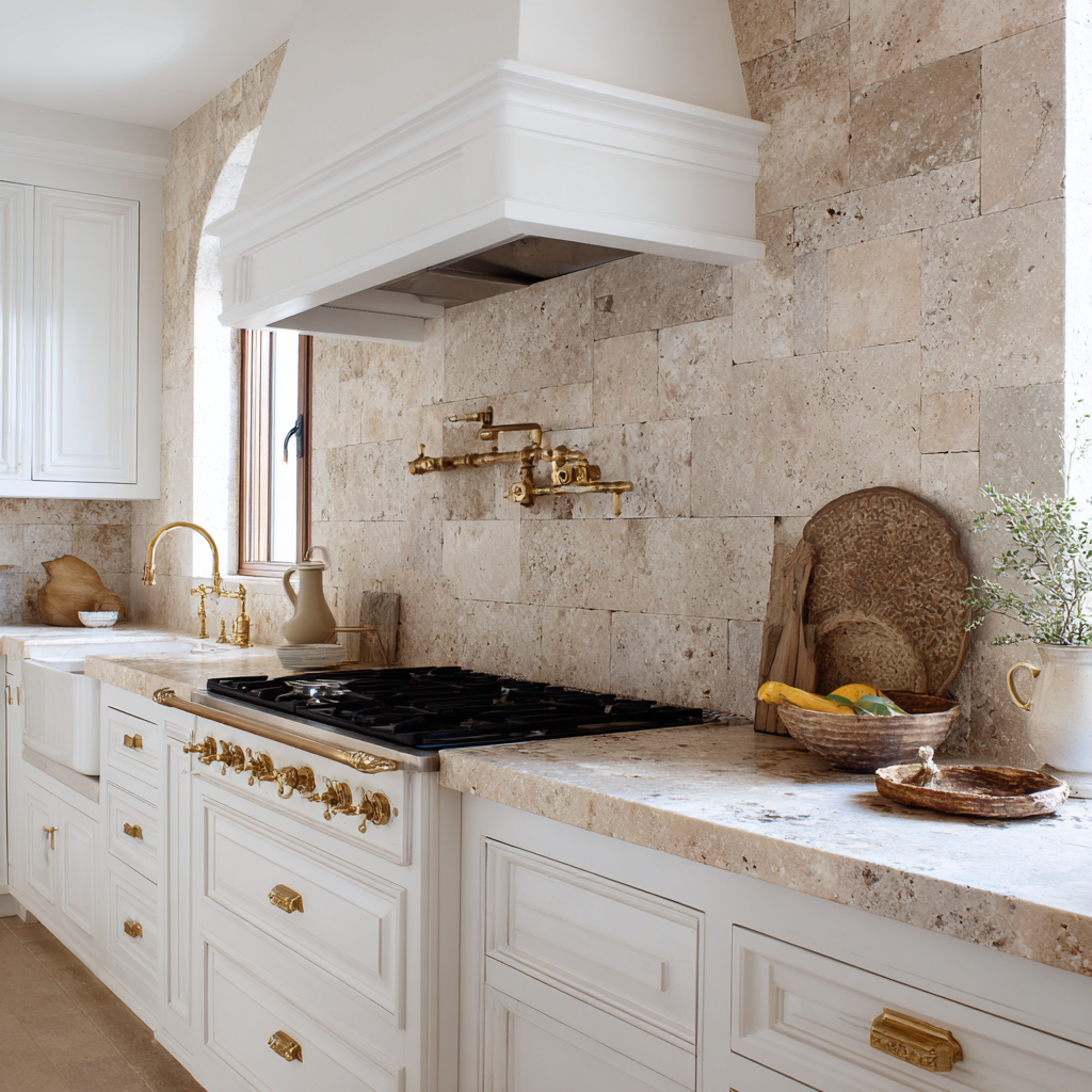 Travertine offers warm, neutral tones with natural variation that works beautifully with both light and dark cabinet finishes. Its slightly rough texture adds tactile interest while remaining practical for kitchen use. Marble provides elegant veining and classic appeal, though it requires more careful maintenance in kitchen environments due to its porous nature.
