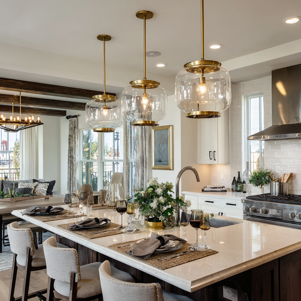 Designer tip: Position pendant lights to hang from or near the beams to create a cohesive lighting scheme that emphasizes the architectural feature while providing functional task lighting.