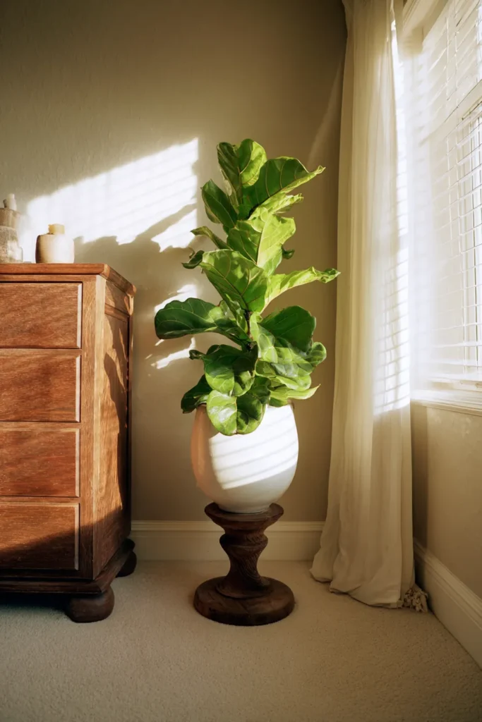 Marble or fluted wood pedestals feel elegant and substantial. Pair with a dark green Monstera or Fiddle Leaf Fig for maximum drama.