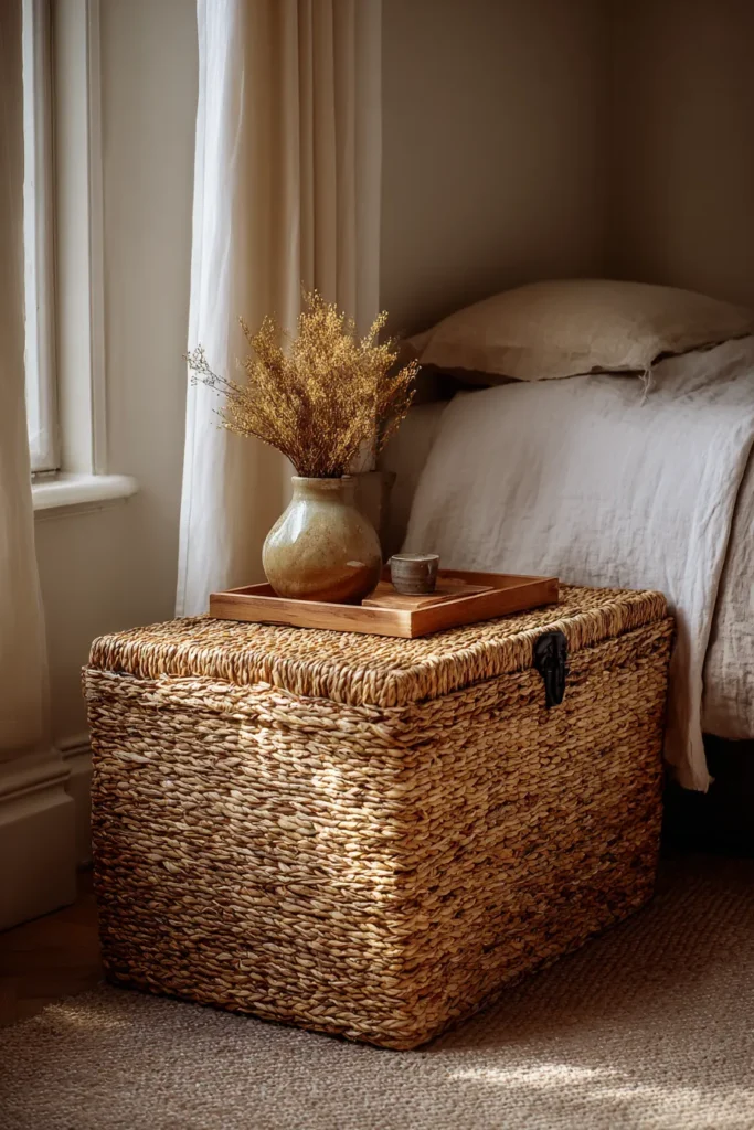 A large rattan trunk grounds a corner beautifully. It hides extra bedding, blankets, or anything else you want out of sight. And it looks like a deliberate design choice while doing it.
