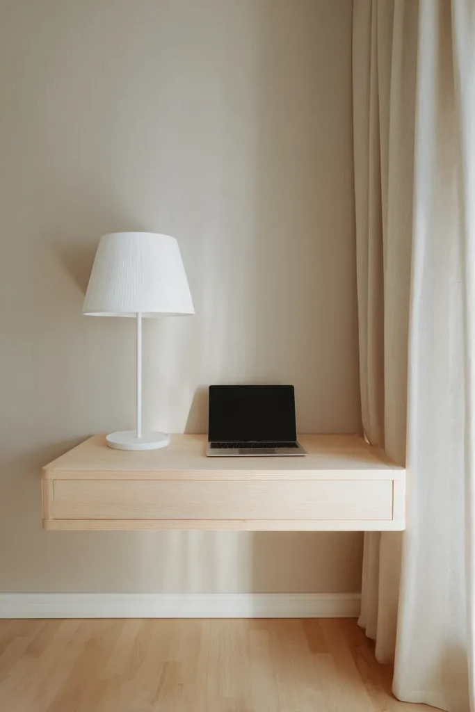 Go minimal. A floating birch wood desk. A matte white adjustable lamp. A stool instead of a bulky office chair.