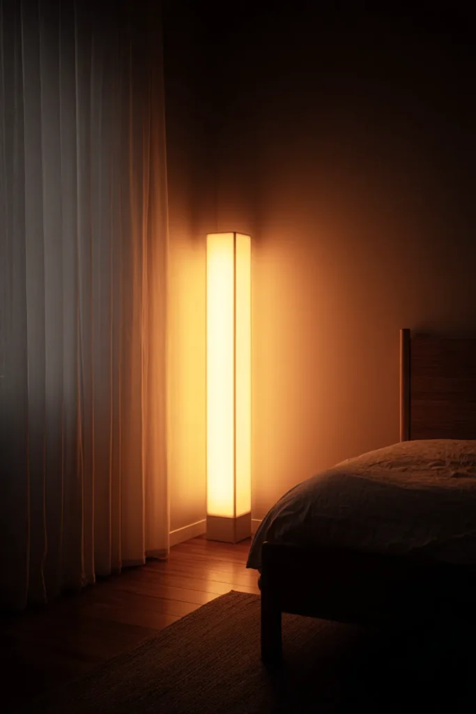 Use a frosted acrylic or fabric column. Warm white LEDs. Keep everything else in the corner neutral so the light does the talking.