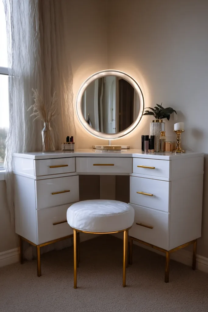 A triangular desk fits the corner perfectly. Add an illuminated round mirror. Go for high-gloss white with gold hardware for a glamorous finish.