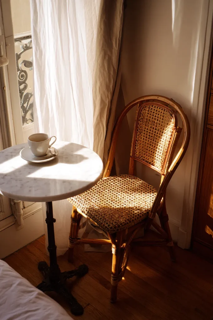 If you have a larger master bedroom, a tiny bistro table in the corner is a genuinely special touch. A round marble top with a woven rattan chair. Morning coffee in your bedroom. No kitchen required.