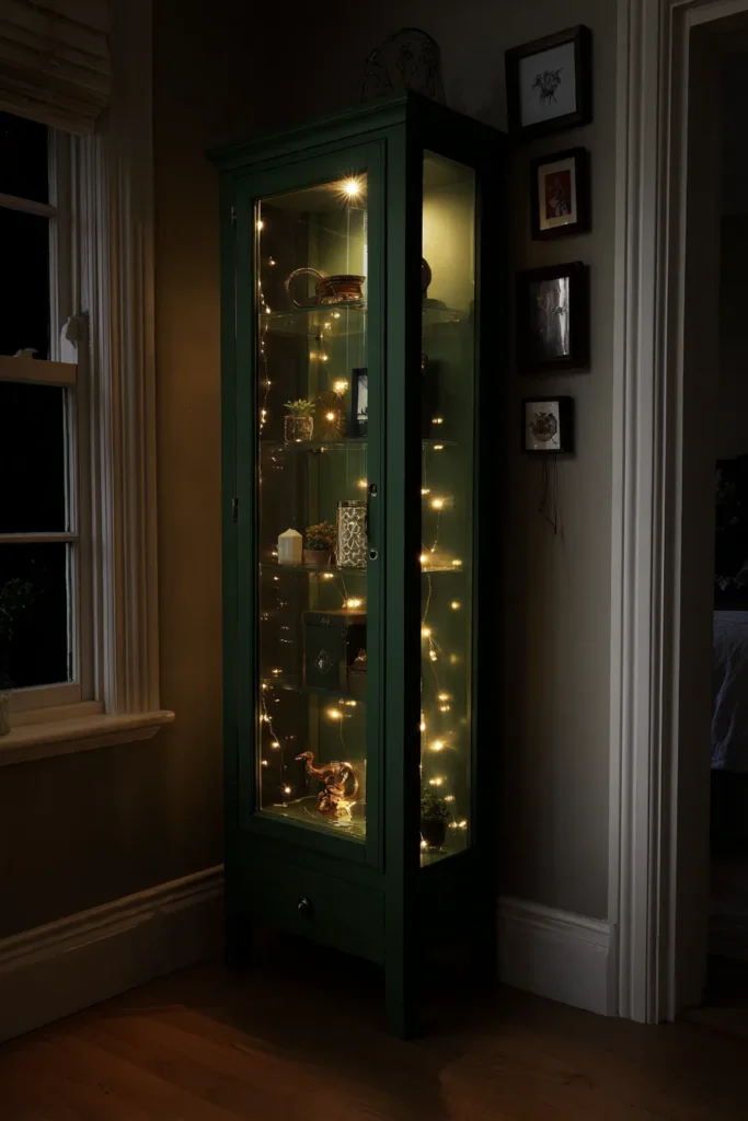 Glass doors with internal LED lighting make your collection feel like an art installation. Deep forest green or dark charcoal finishes look sophisticated. Brass handles add a quiet vintage touch.