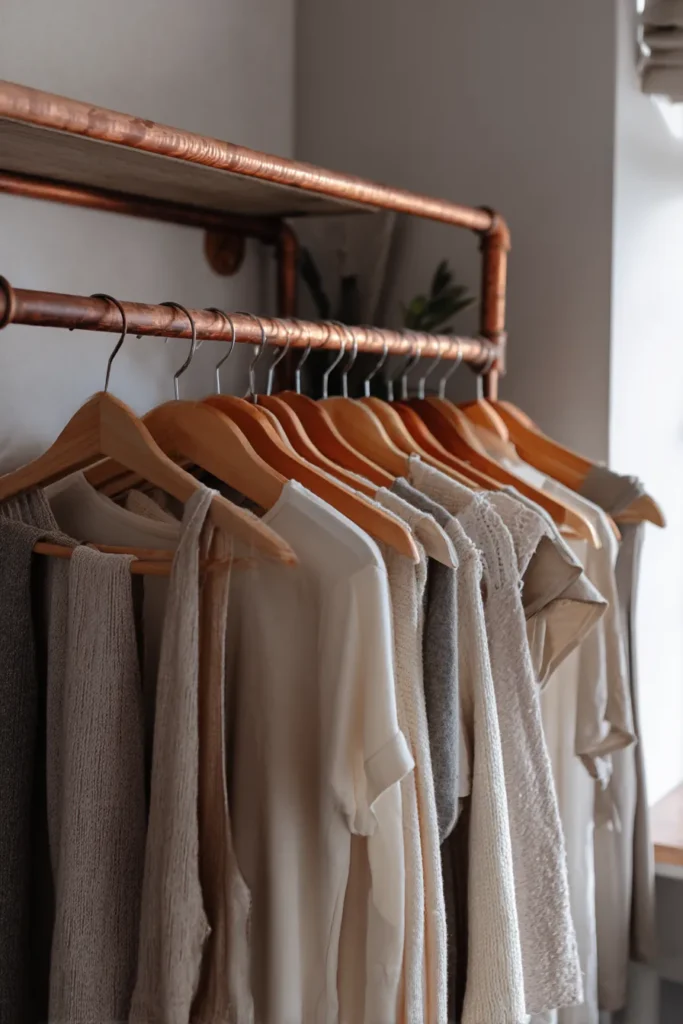 Copper piping looks trendy and warm. Keep the hangers uniform. Slim velvet or sleek wooden hangers only.