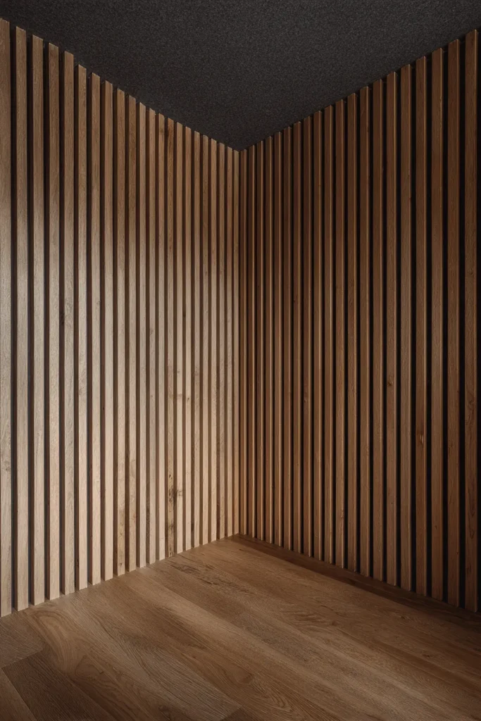 Vertical oak or walnut slats against a black felt backing look stunning. The felt isn’t just decorative either. It actually helps dampen sound in the room.