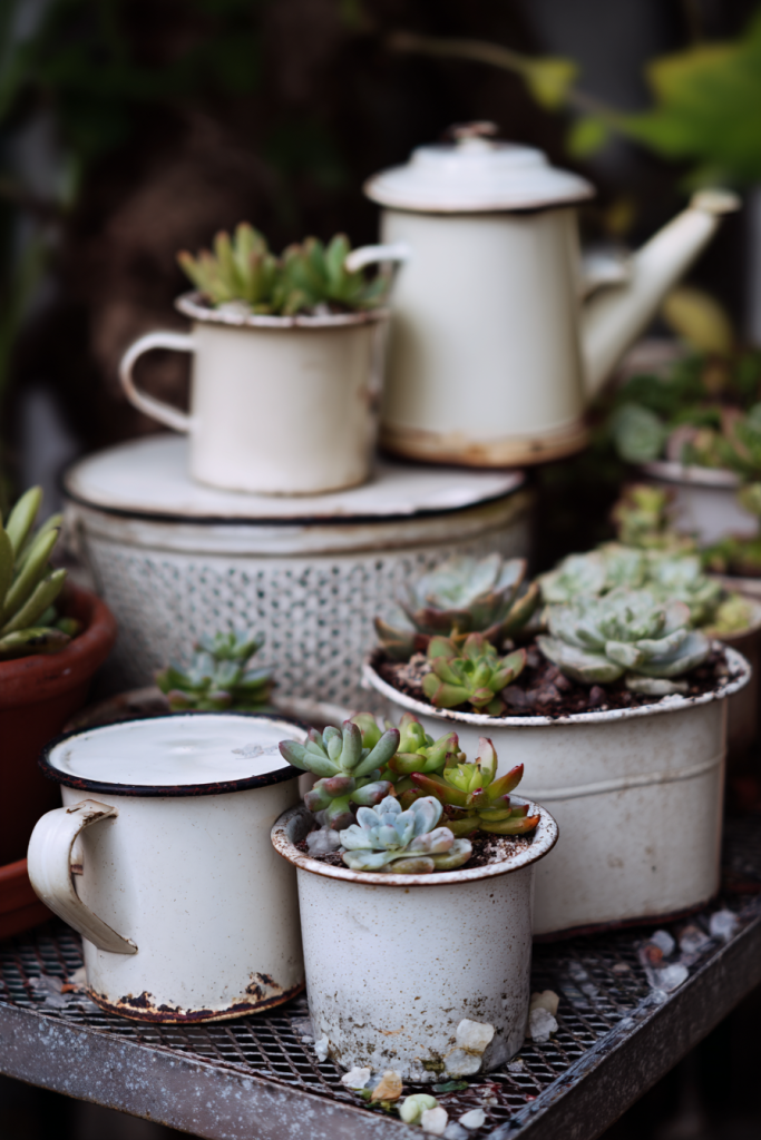 I drill drainage holes in vintage enamelware for unique containers. The chippy white finish and old advertising graphics tell stories that new planters never could.