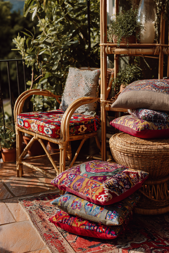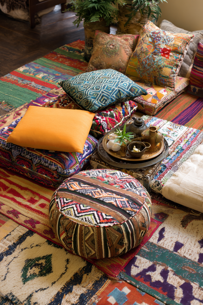 I layer smaller rugs to create depth. The patterns add that essential boho vibe without overwhelming anything.