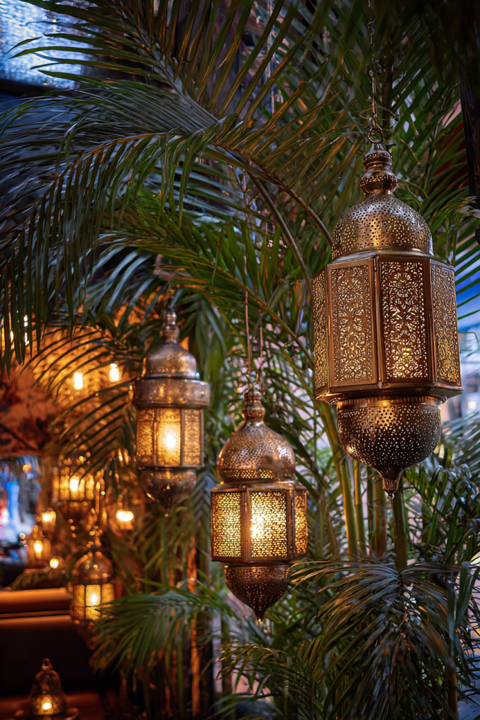 Mix finishes like aged brass, copper, and brushed silver. The geometric patterns add that distinctive Middle Eastern character that screams bohemian style.