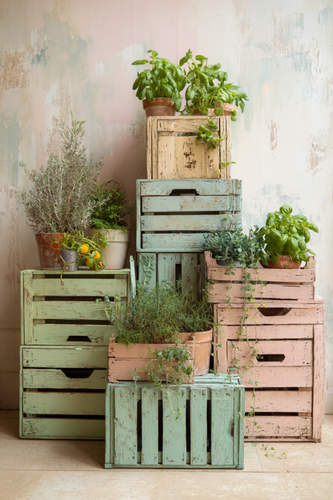 I grabbed a bunch from behind the grocery store (they were giving them away!). Sanded them down, painted them in soft pastels, and boom—instant plant stands.