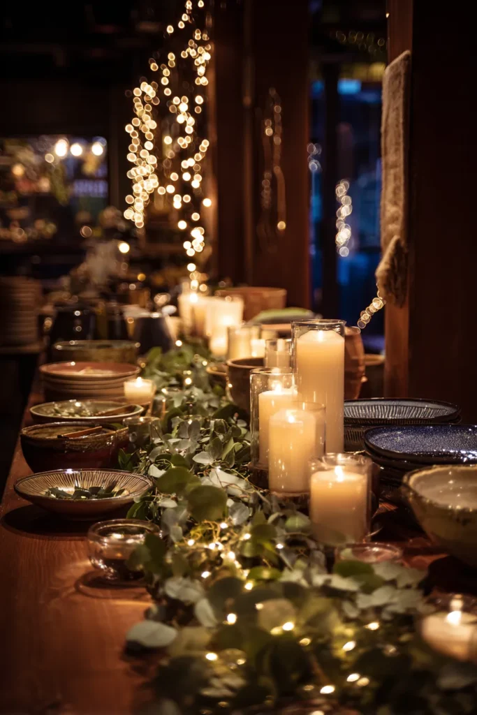 Material Suggestions: LED pillar candles, warm copper fairy lights, small cordless lamps.