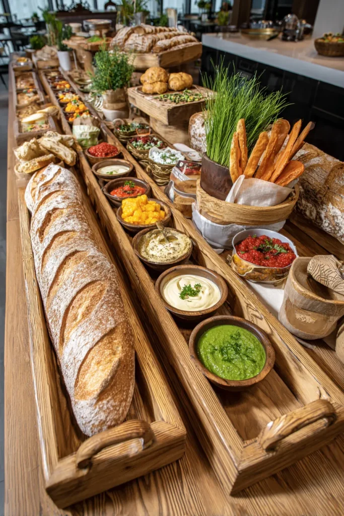Material Suggestions: Long wooden boards for breads, divided ceramic trays for dips.