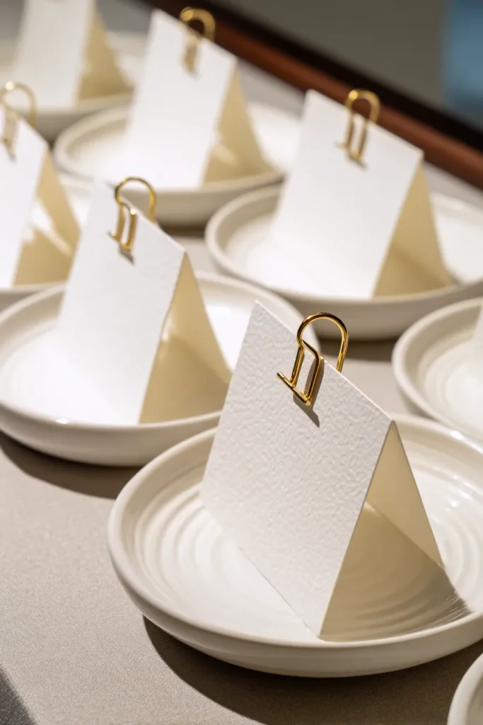 Material Suggestions: Tiny brass card holders, slate tags, thick textured paper.
