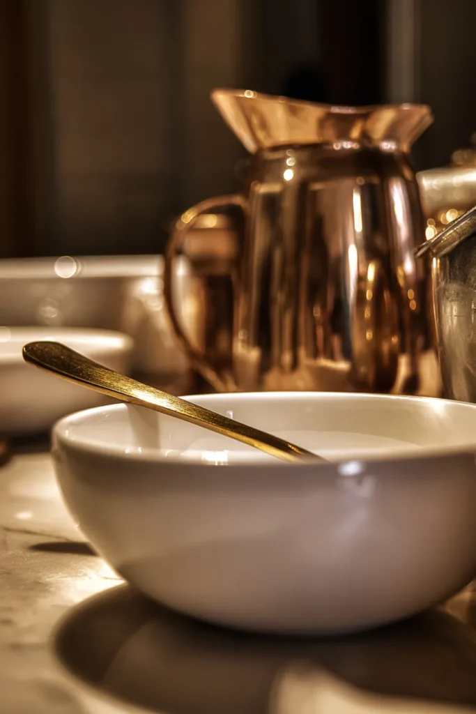 Material Suggestions: Brushed brass serving spoons, silver-rimmed plates, sleek copper mugs.