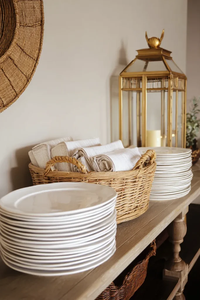 Material Suggestions: Stacked ceramic plates, woven napkin baskets, tall decorative lanterns.