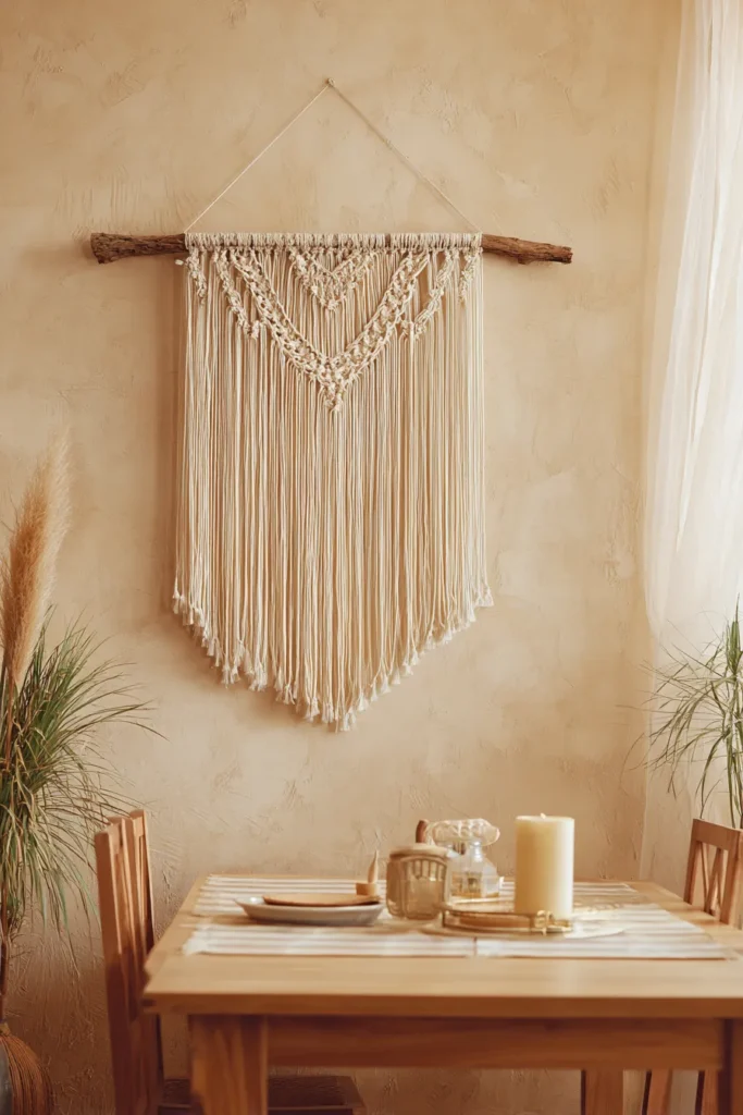 A large macrame wall hanging adds a bohemian warmth that’s hard to achieve any other way. It also does something most people don’t expect. It absorbs sound. So if your dining room tends to echo, this actually helps.