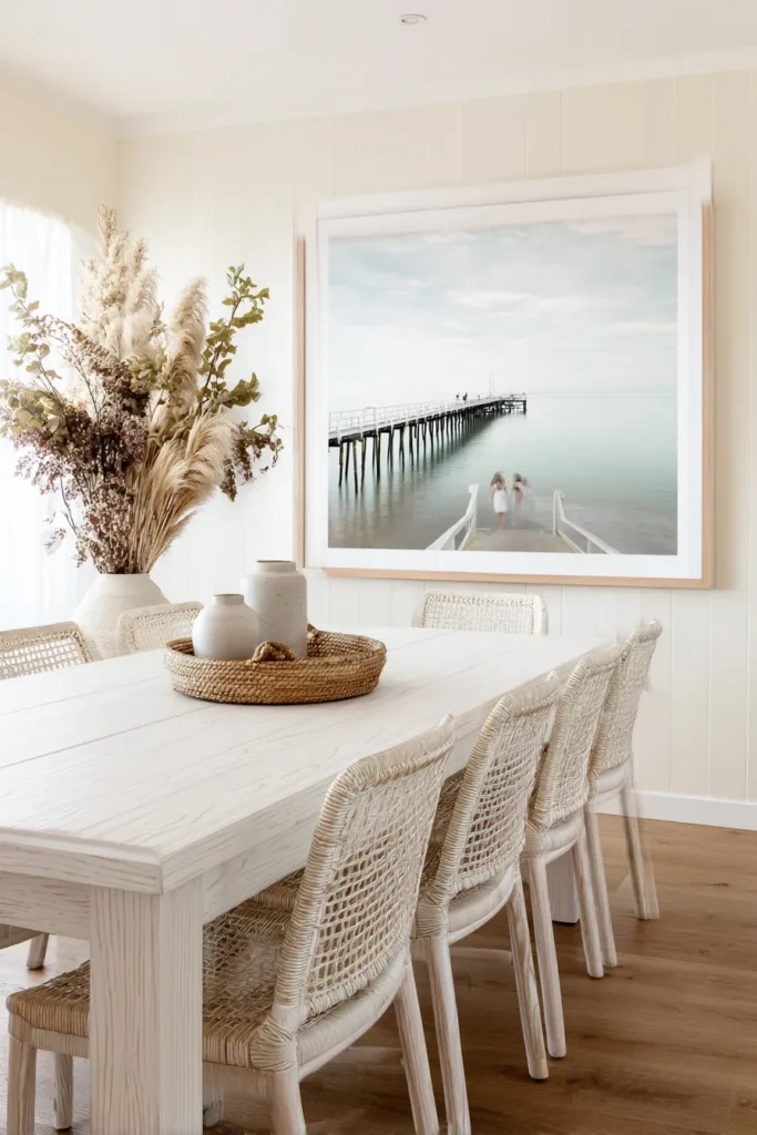 A massive coastal photograph opens up the room and gives dinner guests something calming to look at. It changes the whole energy of the space.