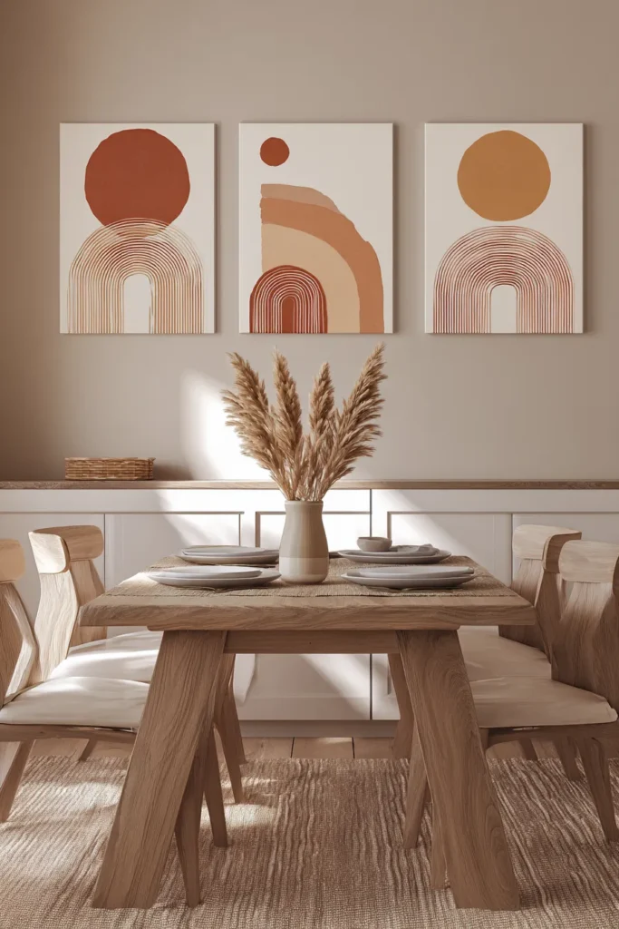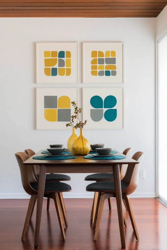 Geometric canvas sets bring structure and visual rhythm. They work especially well in mid-century modern dining rooms where clean lines are already part of the design language.