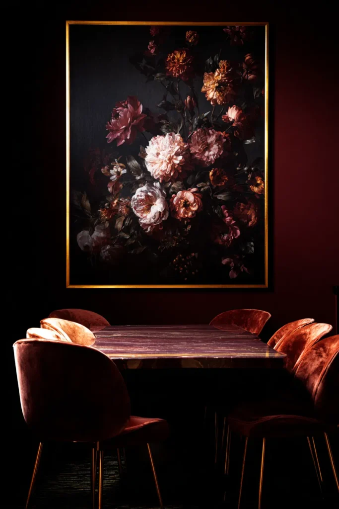 Dark floral canvases bring a Dutch master energy to a modern dining room. Deep blooms on a black background. It’s bold. But in the best possible way.