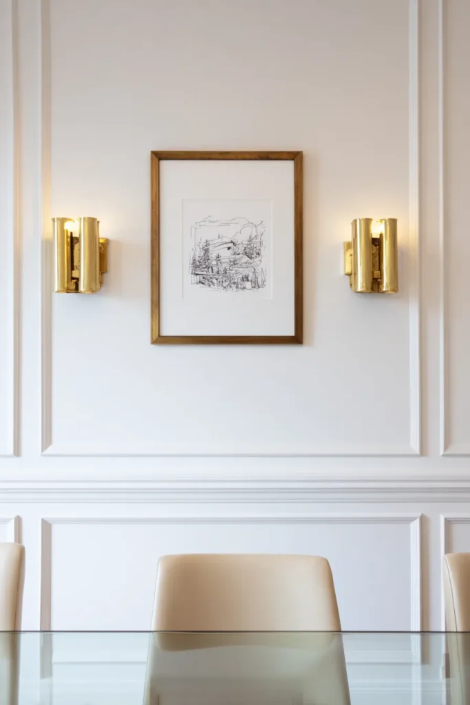 Pairing wall sconces with small framed sketches layers light and art in a way that feels curated rather than random. It’s a look you see in boutique hotels. Totally achievable at home.