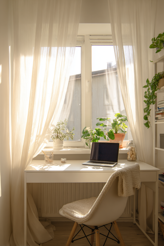 Glare management becomes essential. Install adjustable blinds or sheer curtains to control brightness during peak sun hours. Position your monitor perpendicular to windows rather than facing them directly to minimize screen glare. Some people prefer sitting with the window to their side.