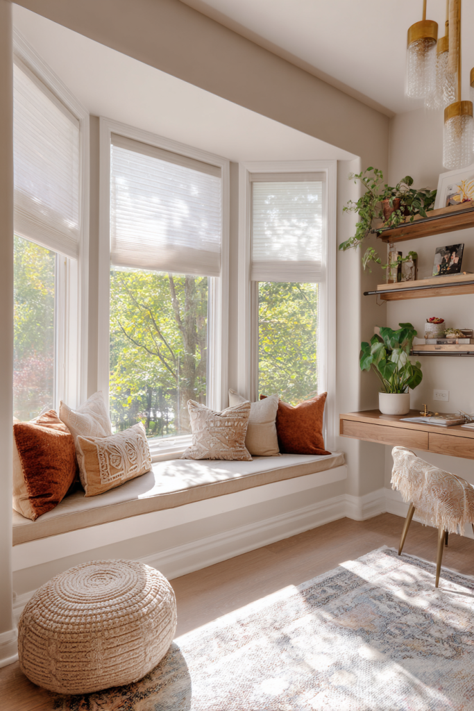 Add cushioned seating on the bay window ledge if depth allows. It becomes bonus workspace for laptop tasks, reading spot during breaks, or extra seating when colleagues visit. A view-oriented office alcove makes work feel less like work.