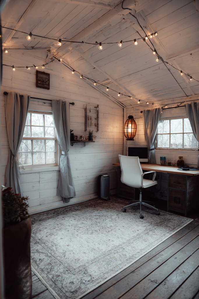 Decorate with the same care you’d give an indoor office. Rugs warm the floor and absorb sound. Curtains or blinds provide privacy and light control. A small coffee station, just a kettle and mugs, eliminates trips back to the main house during focused work sessions.