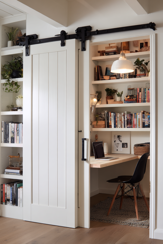 Converting a closet into a hidden office gives you the best of both worlds: dedicated workspace that disappears behind sliding barn doors. Remove closet rods and install a floating desk at the back wall. Add shelving on side walls for vertical storage.
