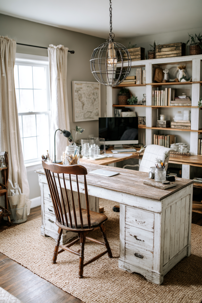 Rustic farmhouse style brings country charm to home offices. A distressed wood desk, maybe one you refinished yourself, anchors the space with character. Pair it with a vintage chair or modern Windsor-style seating. Whitewashed or natural wood tones keep the vibe light.