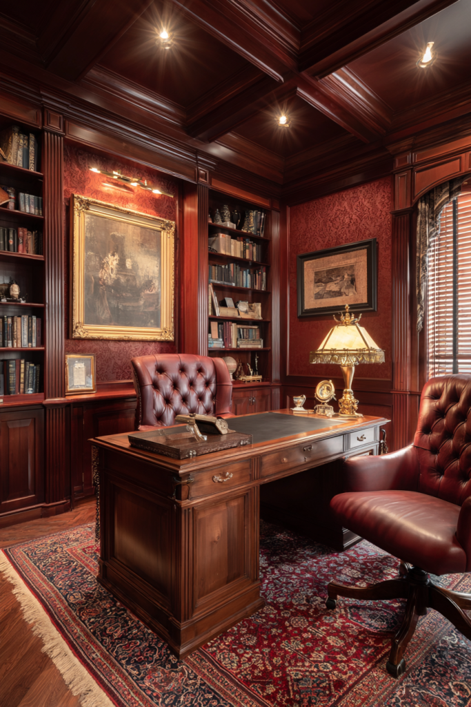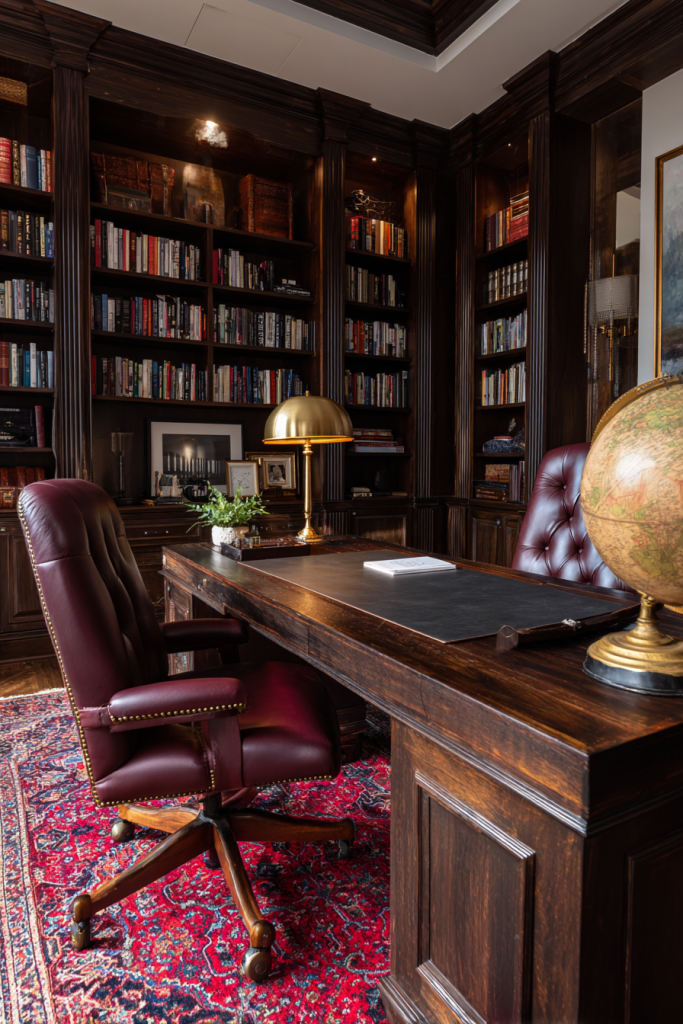 Traditional furniture means quality construction. Look for dovetail joints, solid wood (not veneer), and pieces built to last decades. A tufted leather chair, Persian-style rug, and brass desk accessories complete the scholarly aesthetic.