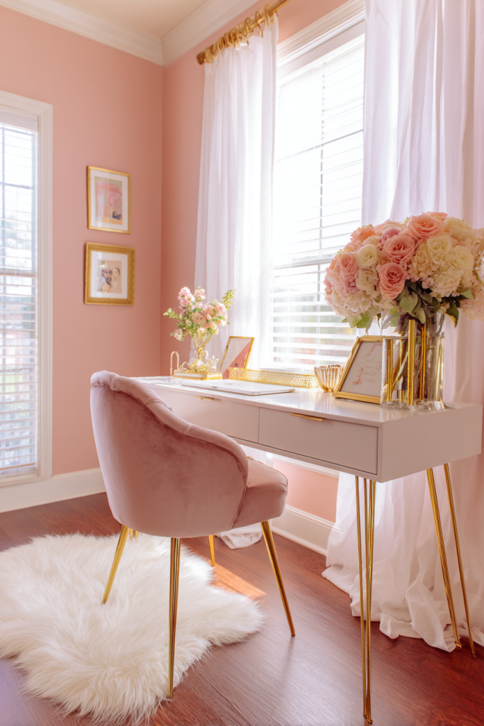 5. Feminine Workspace with Soft Pink and Gold Decor