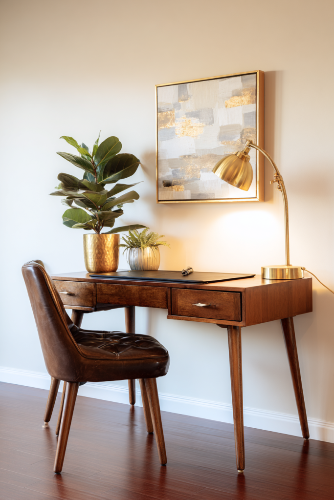 Style your mid-century desk with minimal accessories. A simple brass lamp, one statement plant, and a leather desk pad complement the aesthetic without cluttering it. Too many items ruin the streamlined vibe these pieces are famous for.
