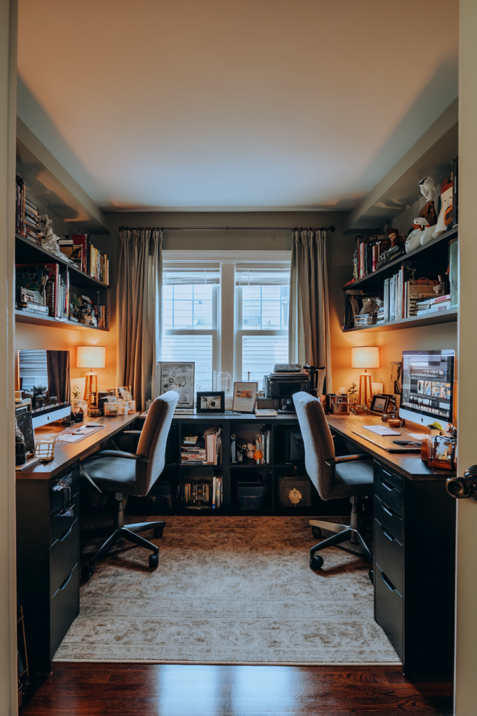 Back-to-back desks maximize room efficiency while providing natural separation. You’re near each other without constantly being in each other’s eyeline. Add a low bookshelf between desks for a gentle divider that still allows communication. Each person customizes their side independently.