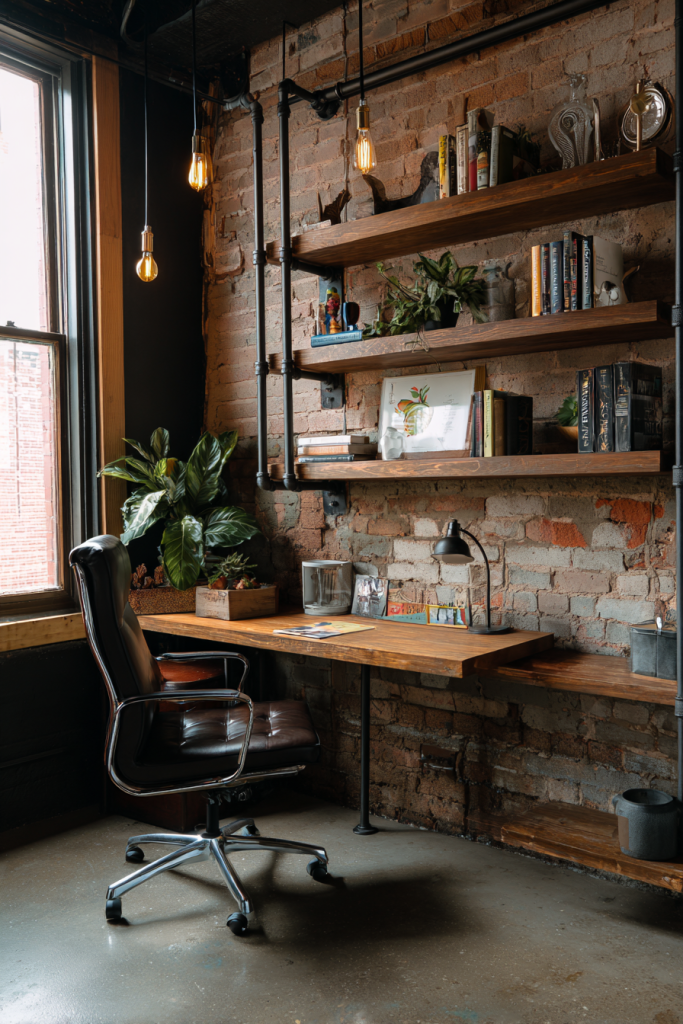 Industrial aesthetics bring warehouse cool straight to your home office. Exposed metal pipe shelving paired with reclaimed wood creates storage that looks intentional, not improvised. Black iron pipes contrast beautifully against rustic wood tones and exposed brick.