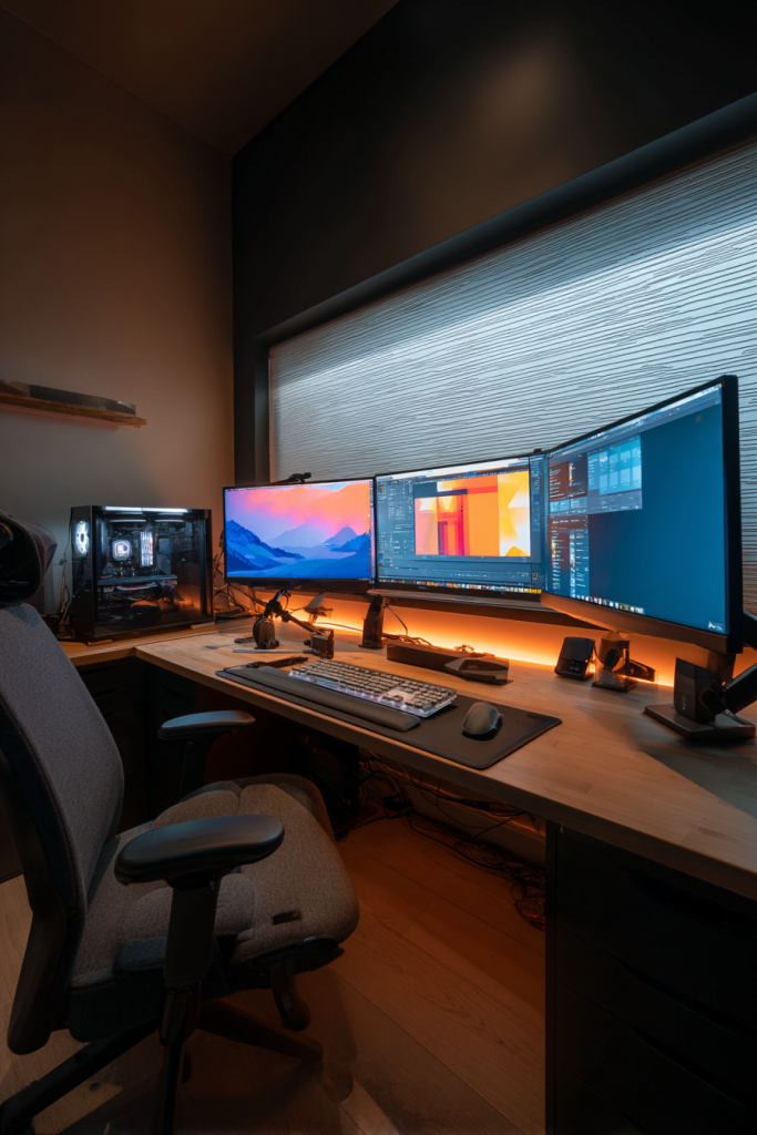 Invest in a quality desk with adequate depth. You’ll need 30+ inches from front to back to position monitors at proper viewing distance. Consider an L-shaped desk if you’re running three or more screens. Make sure your desk can handle the weight.
