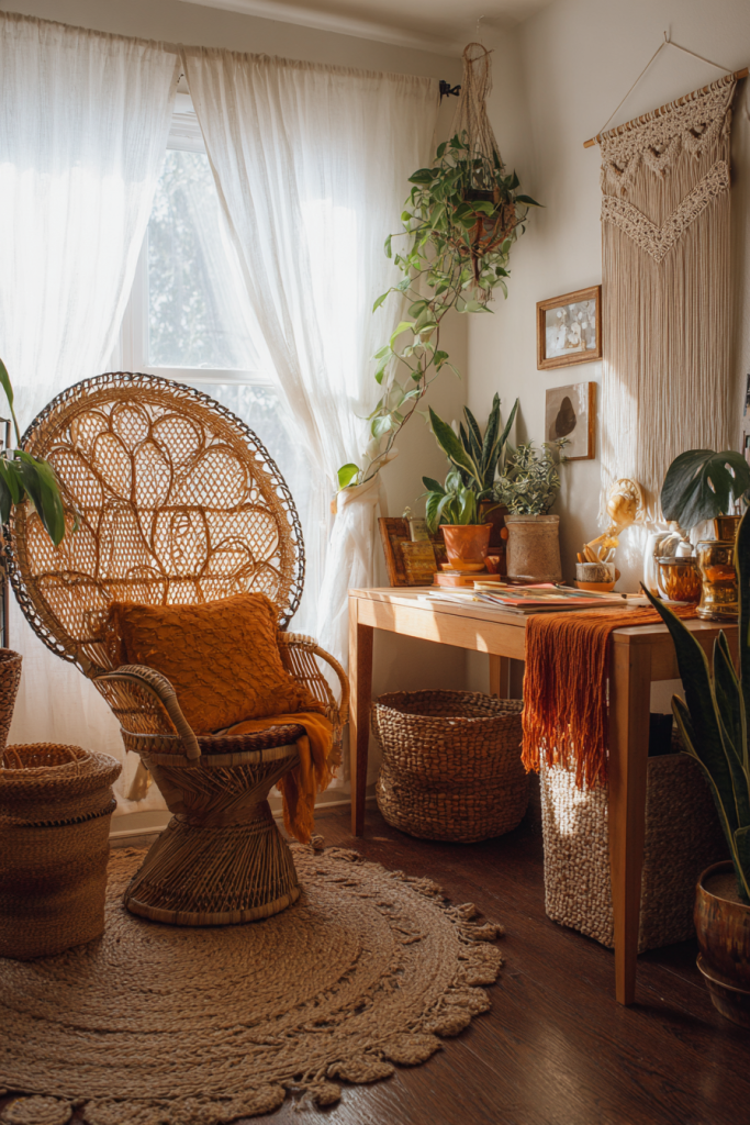 8. Boho Home Office with Rattan Chair and Woven Rugs