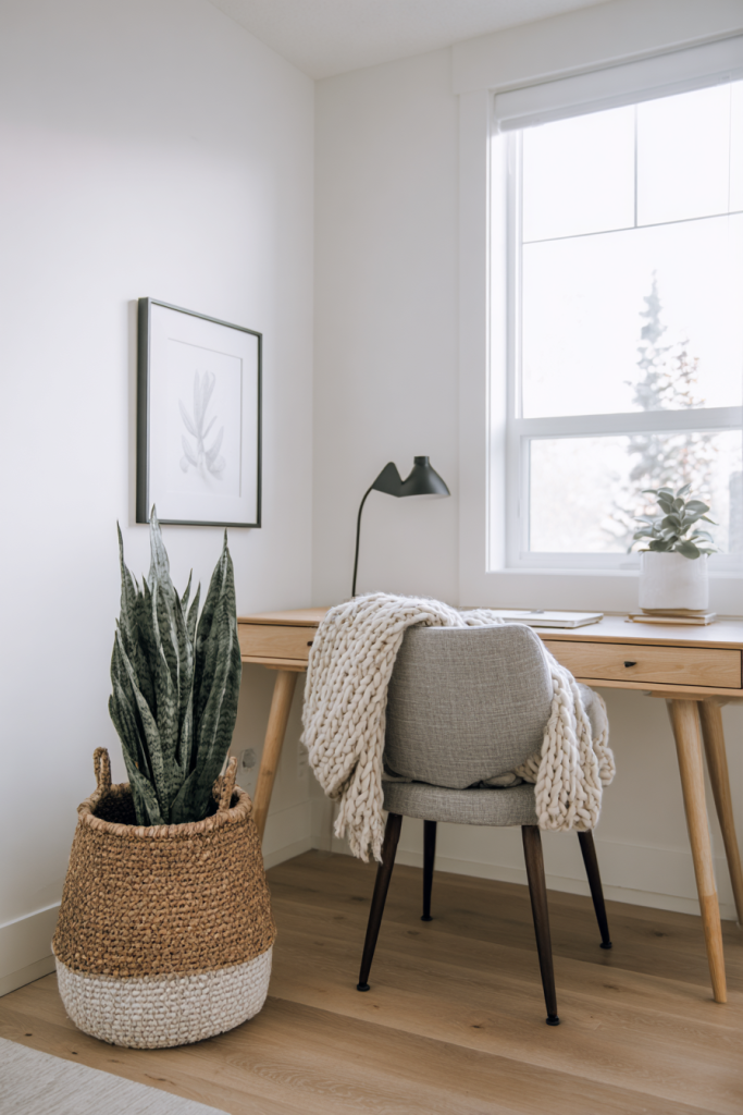 Scandinavian design champions simplicity, functionality, and connection to nature. Start with a light wood desk in birch or ash. Keep walls white or soft gray to maximize light reflection. Add texture through a chunky knit throw, woven basket, or linen cushion.