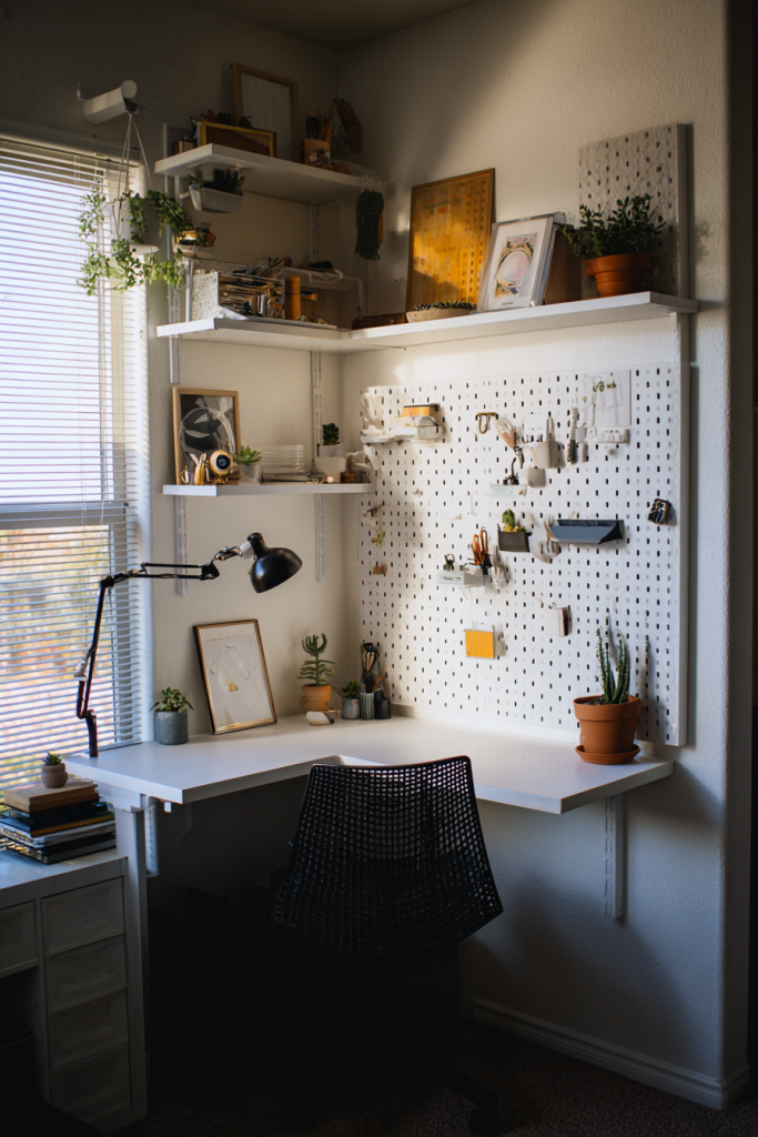 Pegboards work beautifully in corner setups. Mount one from desk height to ceiling for maximum storage flexibility. Hang frequently-used items on hooks and small shelves. Everything stays visible and accessible without consuming precious square footage.