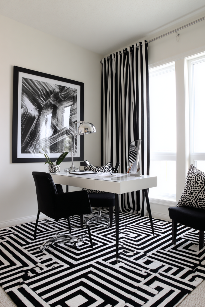 Black and white doesn’t mean boring when you add bold graphic prints. Oversized geometric patterns on a rug, curtains with strong stripes, or large-scale abstract art energize the monochrome palette. The contrast creates drama without color chaos.