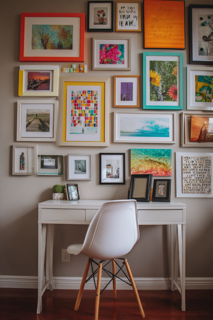 A gallery wall transforms a basic desk into an inspiring creative hub. Mix framed prints, photographs, inspirational quotes, and maybe a small mirror or two. Varying frame sizes and colors creates visual rhythm that energizes rather than overwhelms.