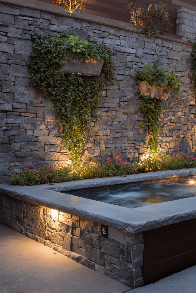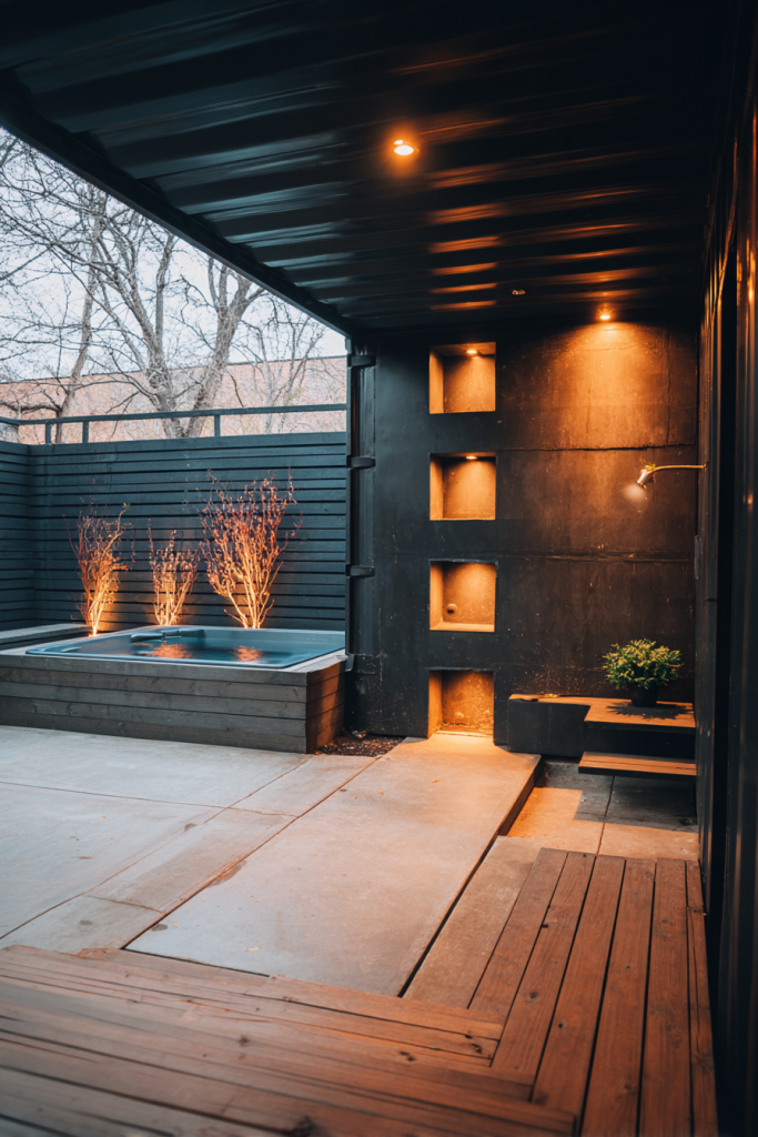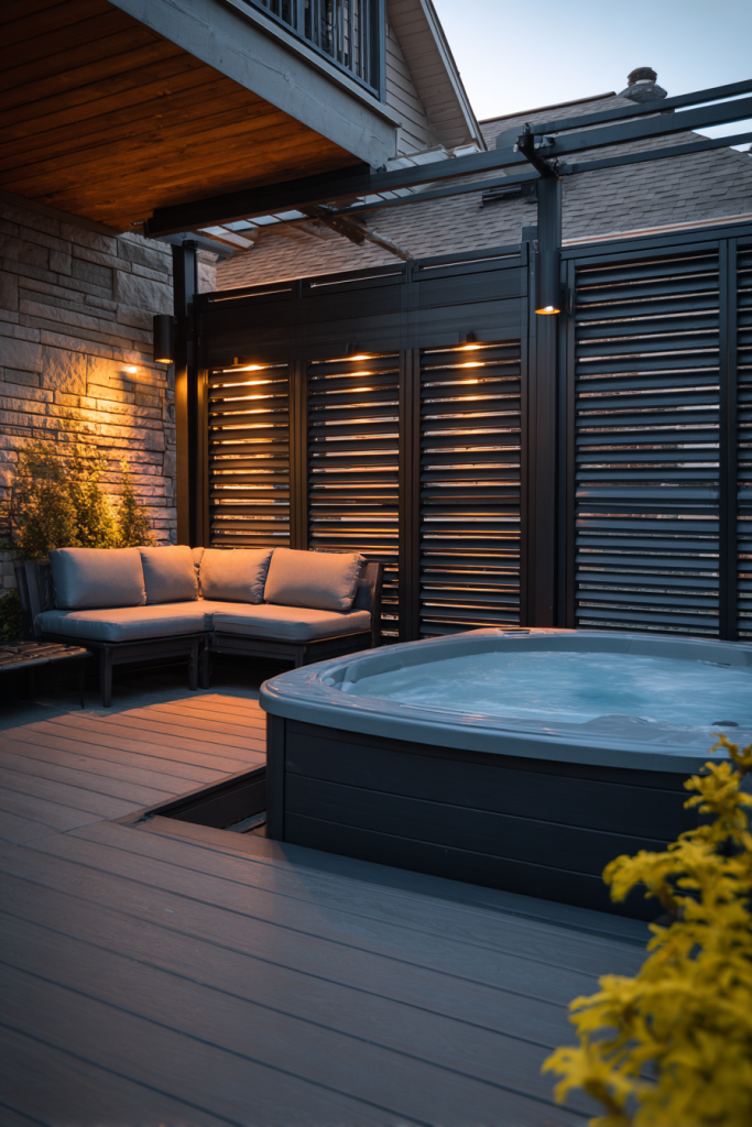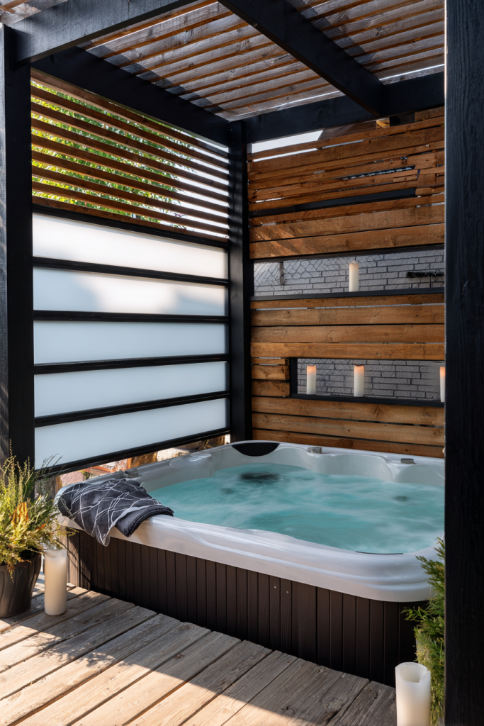 Here’s the key though: Balance is everything. Pair them with warm wood accents. Otherwise your hot tub area might feel too cold and sterile.