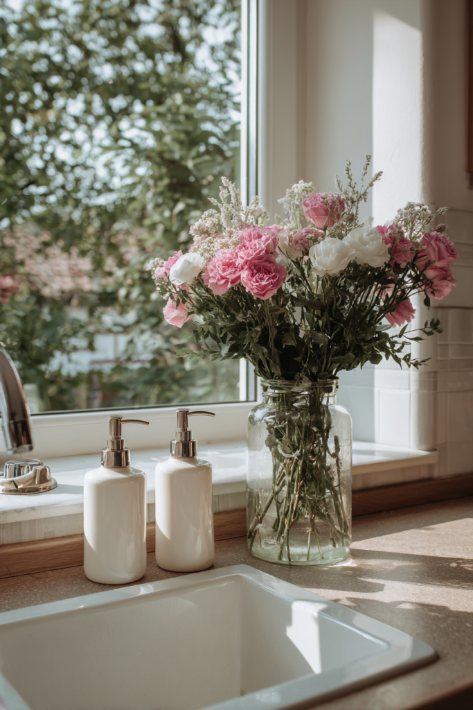 Fresh flowers in a simple vase beside coordinating soap dispensers prove that daily routines can have style. This small touch makes washing dishes feel a little more pleasant. And your kitchen look more intentional.