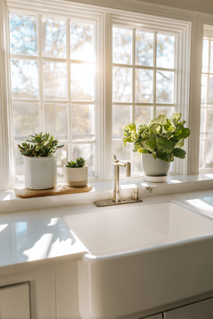 The combination of natural light, greenery, and classic sink design creates an inviting space where you’ll actually enjoy spending time doing dishes.