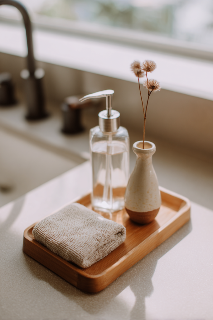 A bamboo tray gathering dish soap, hand towels, and honey-toned accents transforms mundane necessities into an intentional composition. This approach makes cleaning supplies feel like part of your decor.
