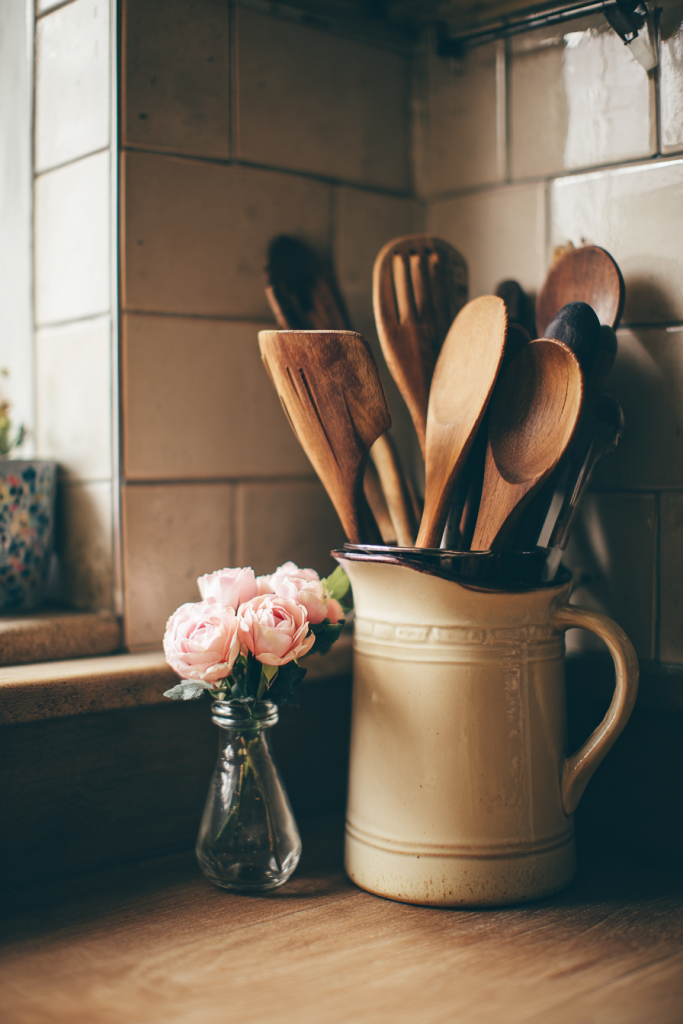 Gather your most beautiful wooden spoons. Place them in a ceramic jar or lean them against a small cutting board.