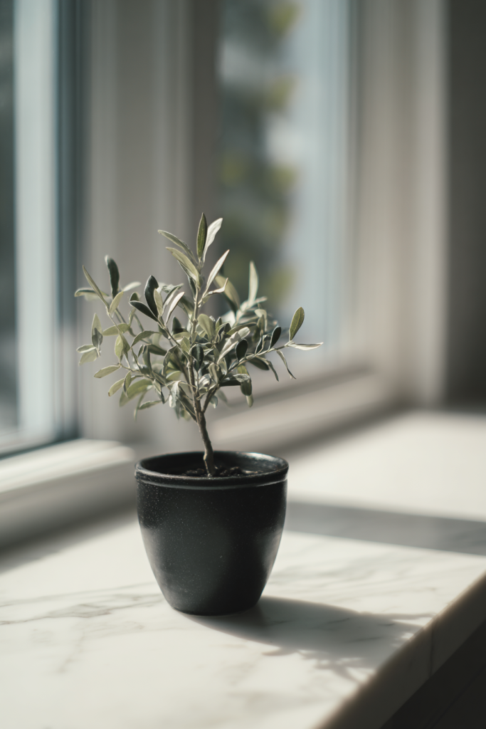 A petite olive tree in a black pot brings organic texture and earthy contrast to streamlined spaces. It’s a reminder that living elements soften modern kitchens. And connect us to nature.