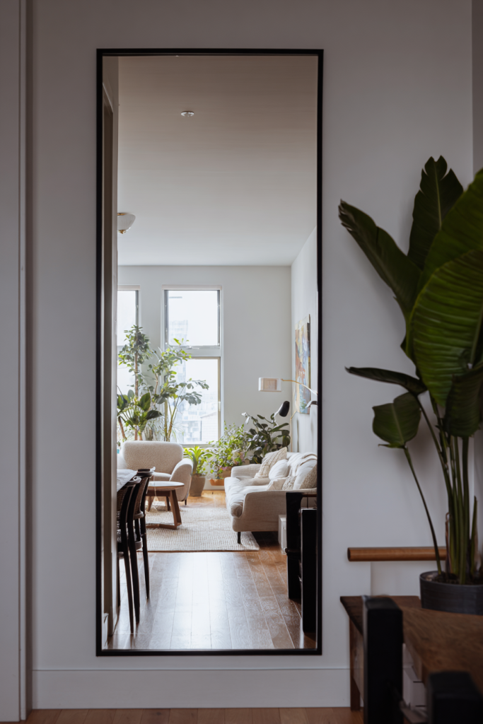 For living areas, a mirror above the sofa or on a side wall adds depth without taking up floor space.