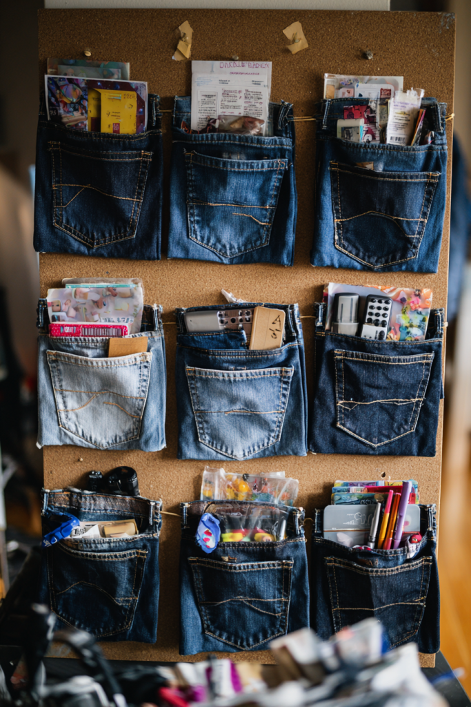 Cut pockets off old jeans. Stitch them onto canvas backing. Hang it on the wall.